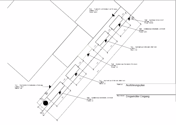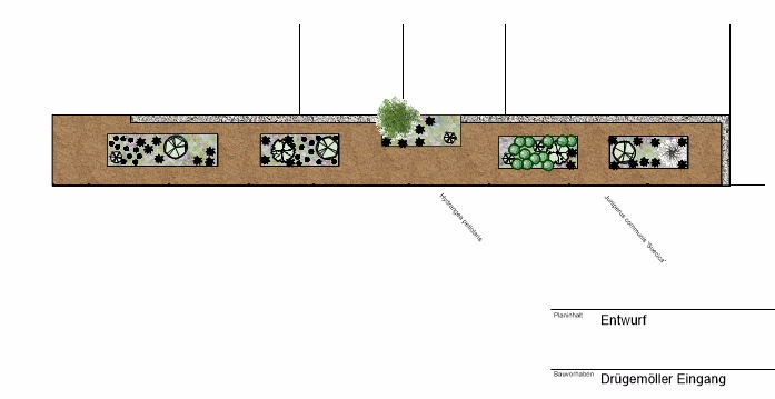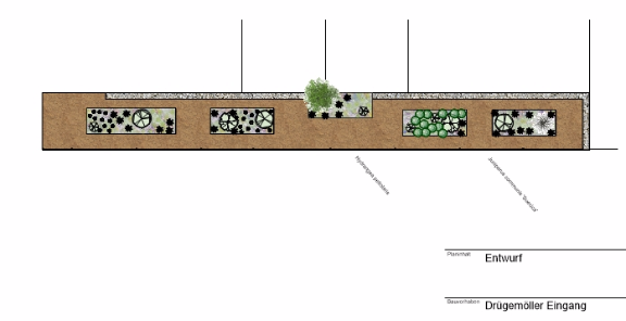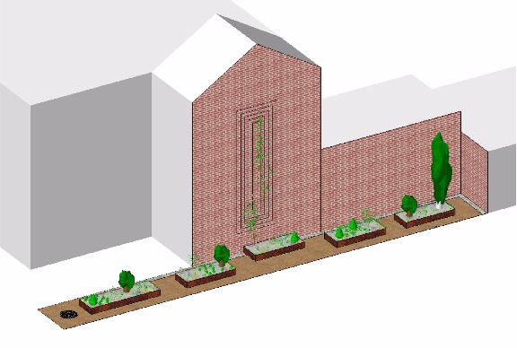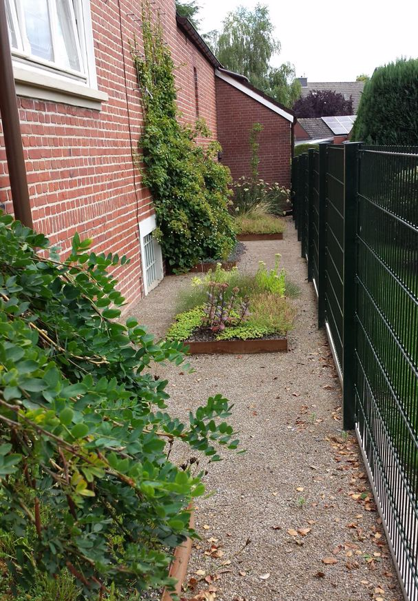 Als Entwurf in 2D, Hochbeete aus Corten-Stahl umfasst von Kiesflächen. An der Fassade eine Kletterpflanze mit Rankgerüst nach Empfehlung der FLL-Fassadenbegrünung